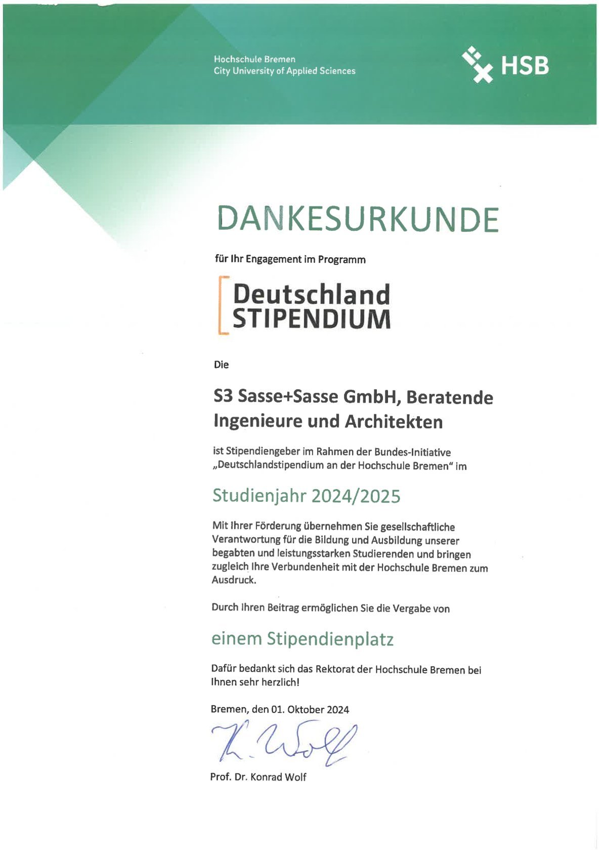 Schon seit mehreren Jahren unterstützen wir Studierende der Hochschule Bremen im Rahmen der Bundesinitiative Deutschlandstipendium. Denn unsere Überzeugung ist: die kommenden Generationen von Architekten und Ingenieuren spielen eine entscheidende Rolle bei der Gestaltung nachhaltiger, innovativer und zukunftsweisender Bauprojekte. Mit unserem Deutschlandstipendium möchten wir den Weg für vielversprechende Talente ebnen, die einen Beitrag zur Weiterentwicklung unserer Branche leisten. Bildung und Talentförderung sind Grundpfeiler für eine nachhaltige Zukunft der Baubranche.